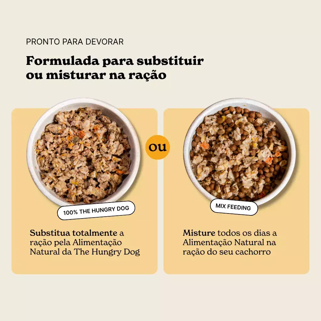 Ela pode substituir completamente ou ser misturada na ração, trazendo nutrientes em uma forma muito mais natural, saborosa e fácil de digerir.